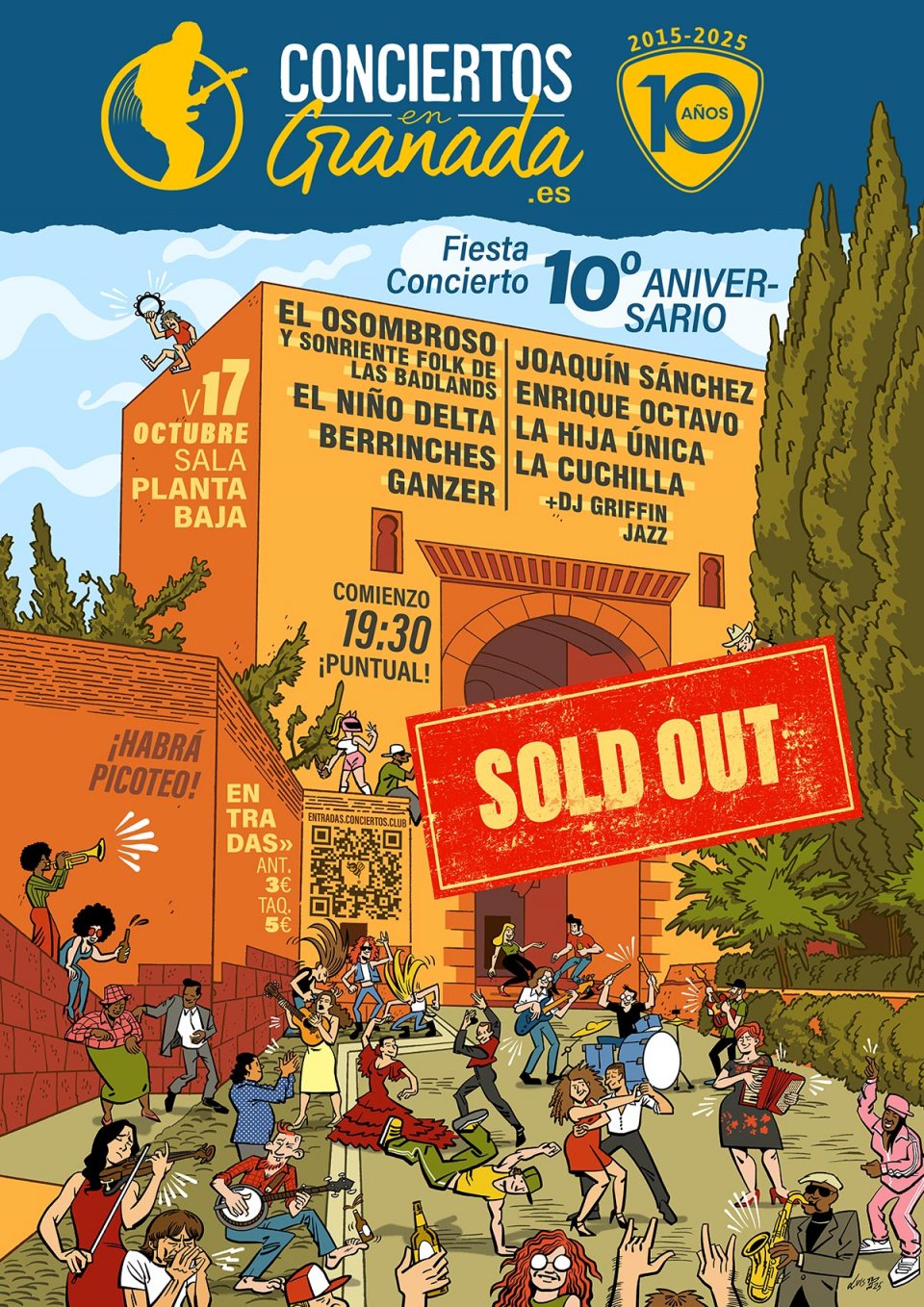 Con motivo del 10º aniversario de la web ConciertosenGranada.es, el Viernes 17 de octubre de 2025 celebraremos una fiesta concierto en Sala Planta Baja con la participación de ocho grupos granadinos.