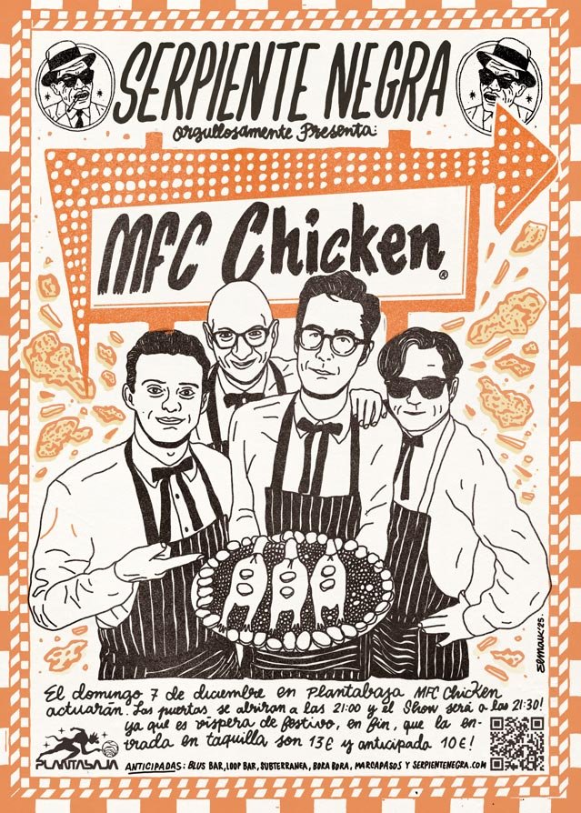 MFC Chicken es una formación cuya música ha sido definida como “la que The Sonics escuchaban”. Toda una temeridad de la que suelen salir airosos, pues su propuesta inequívocamente bailable, sudorosa, vibrante y entregada, en el punto intermedio donde se encuentran el garage y el rock and roll más excitante, ha vuelto boca abajo las salas de toda Europa por las que han paseado su ardorosa música.
