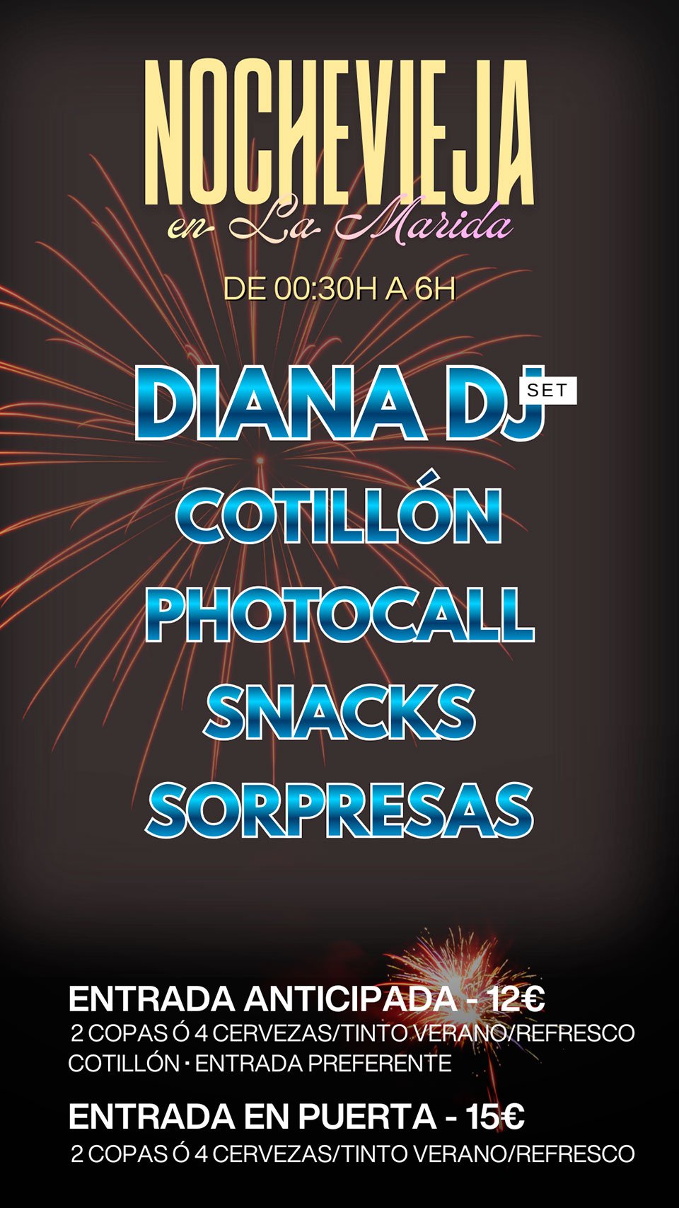 Entrada anticipada - 12€ + GG. Incluye 2 copas o 4 cervezas, cotillón y entrada preferente.