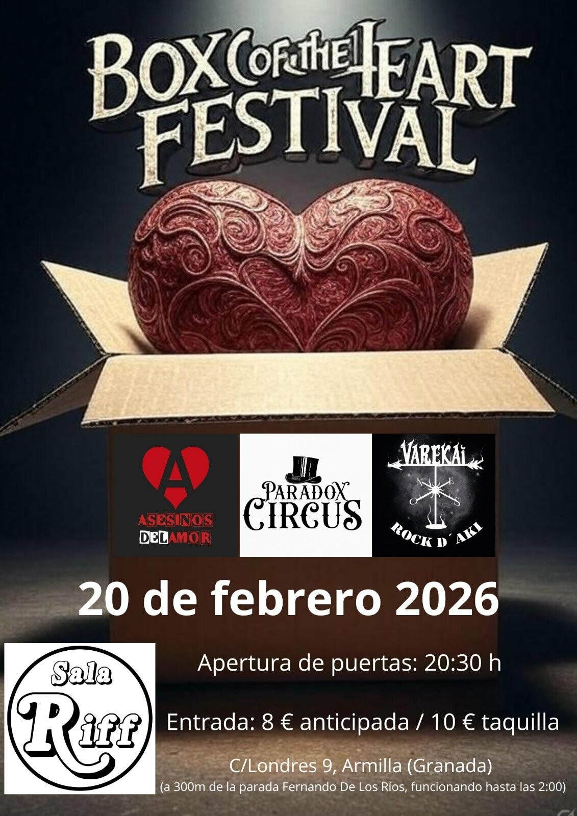 Festival Box and Heart se celebra en la Sala Riff de Armilla (Granada) con la participación de los grupos Paradox CIRCUS (granada), Asesinos del Amor (jaén) y Varekai (granada).