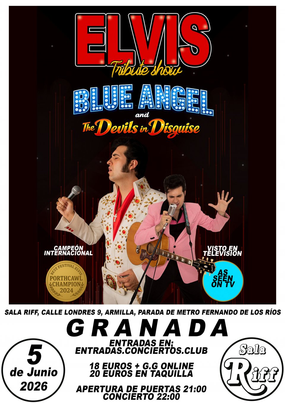Blue Angel, ganador del prestigioso premio internacional de Porthcawl presenta junto a su banda The Devils in Disguise un tributo que hará viajar en el tiempo al publico a través de los grandes éxitos del rey del rock and roll con una espectacular puesta en escena.