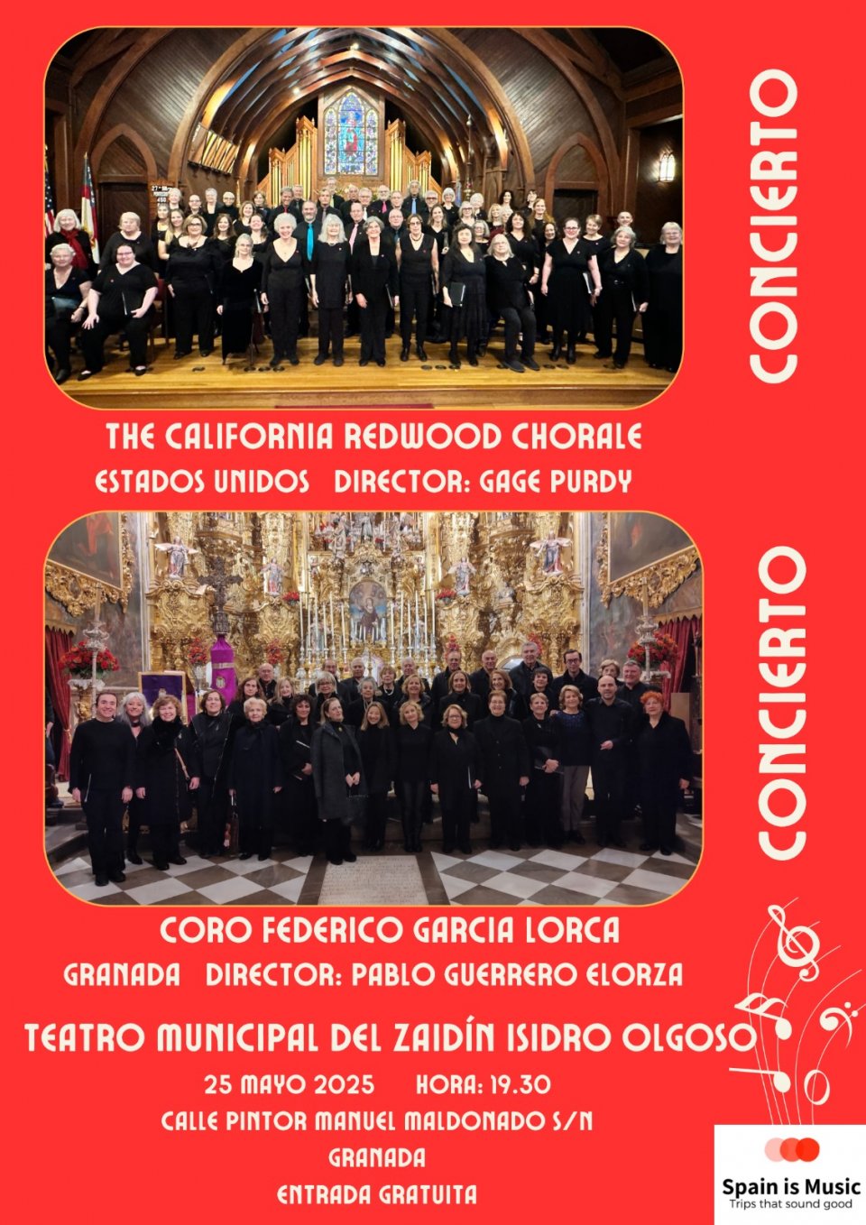Concierto gratuito en el Teatro Zaidín de Granada de dos coros, el coro estadounidense The California Redwood Chorale y el Coro Federico García Lorca.